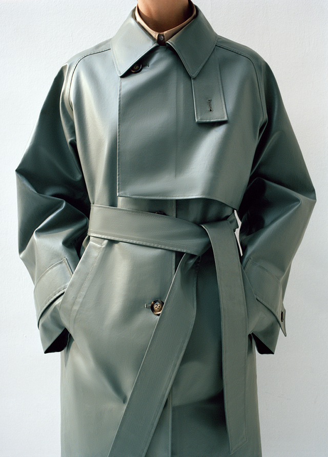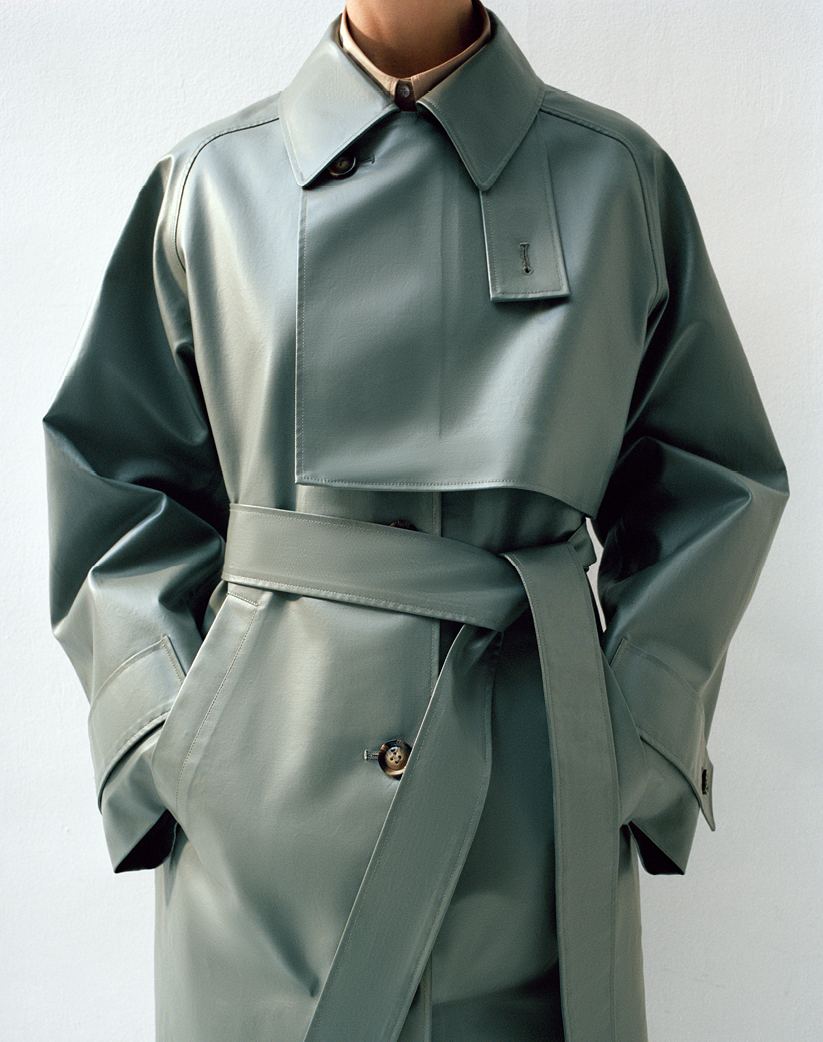La gabardina se reinventa. Un panel asimétrico, con brillos y en un material revestido en color gris pastel verdoso: una prenda de entretiempo para una apariencia atemporal.