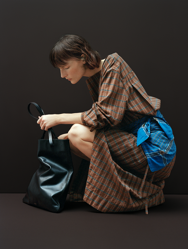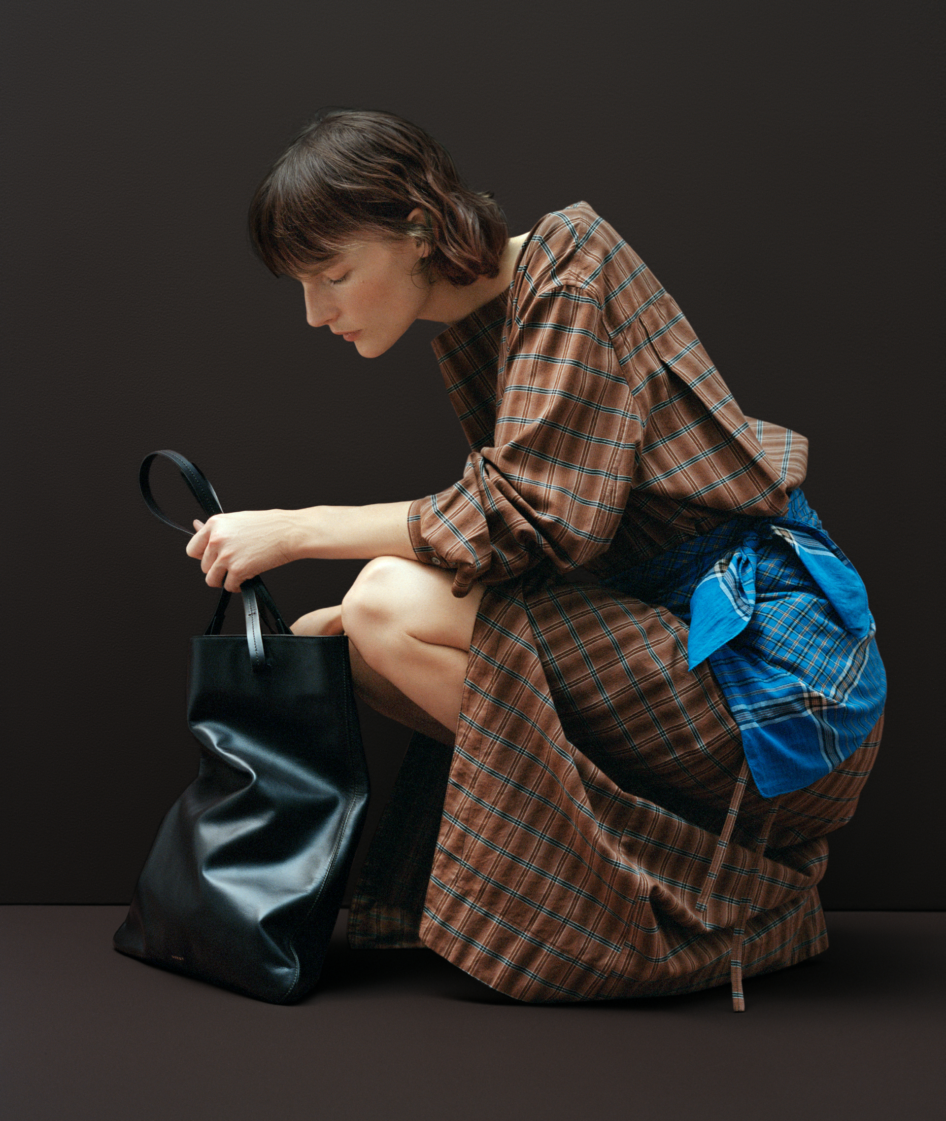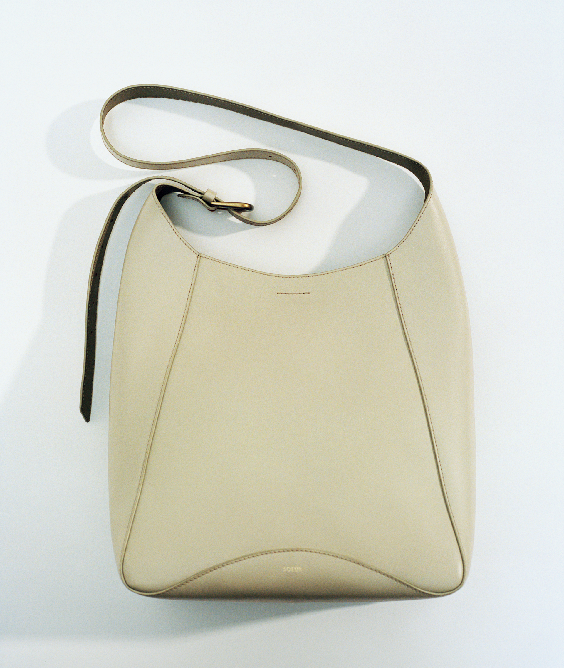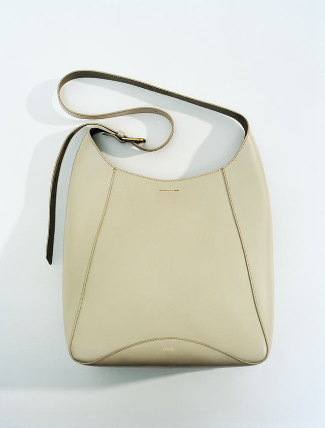 Un elegante corte asimétrico en un tono pastel suave que oscila entre el salvia y el arcilla: nuestro nuevo bolso cubo para la nueva temporada.