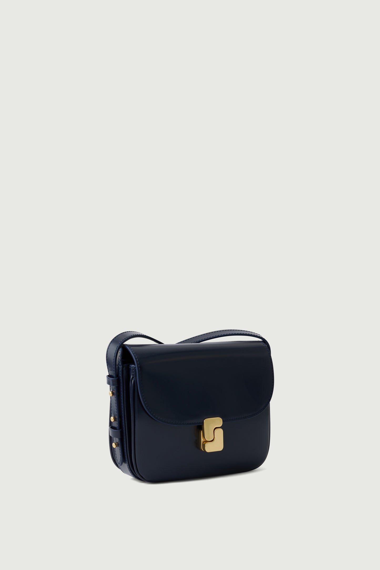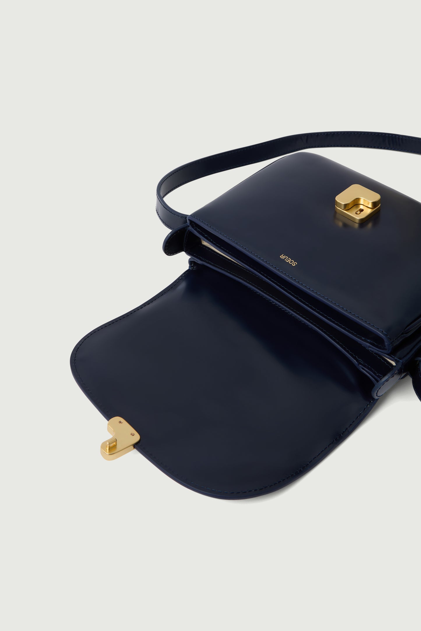 - Gran solapa frontal con cierre con monograma «S» dorado