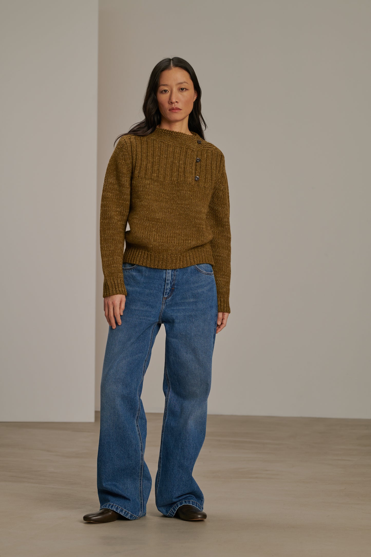 BISCAROSSE is a long-sleeve jumper, knitted from a marled virgin wool yarn. Crafted in a thick yet airy knit, it’s both flexible and comfortable. A buttoned opening at the front allows a side neckline to be revealed. Through a ribbed visual effect, the colour appears marled in shades of khaki and bronze.
